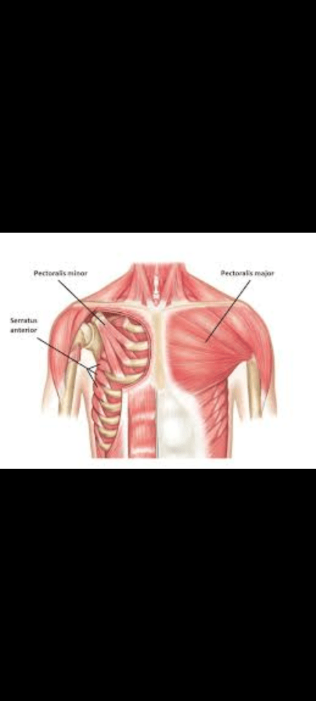 – Pectoralis minor: Helps in stabilization, depression (pulling down), abduction or protraction (spreading), internal rotation and downward rotation of the scapula.